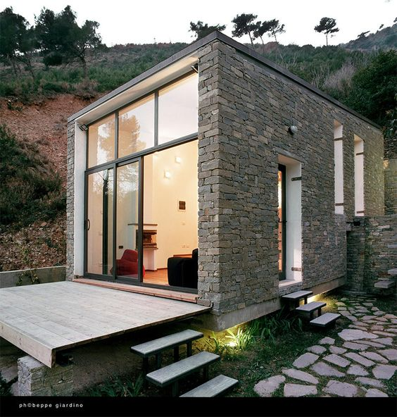 O estilo compõe fachadas sofisticadas, com traços simétricos e acabamento refinado. Normalmente encontrada em escritórios e pequenos prédios comerciais, a arquitetura contemporânea é perfeita para receber uma decoração com pedras.